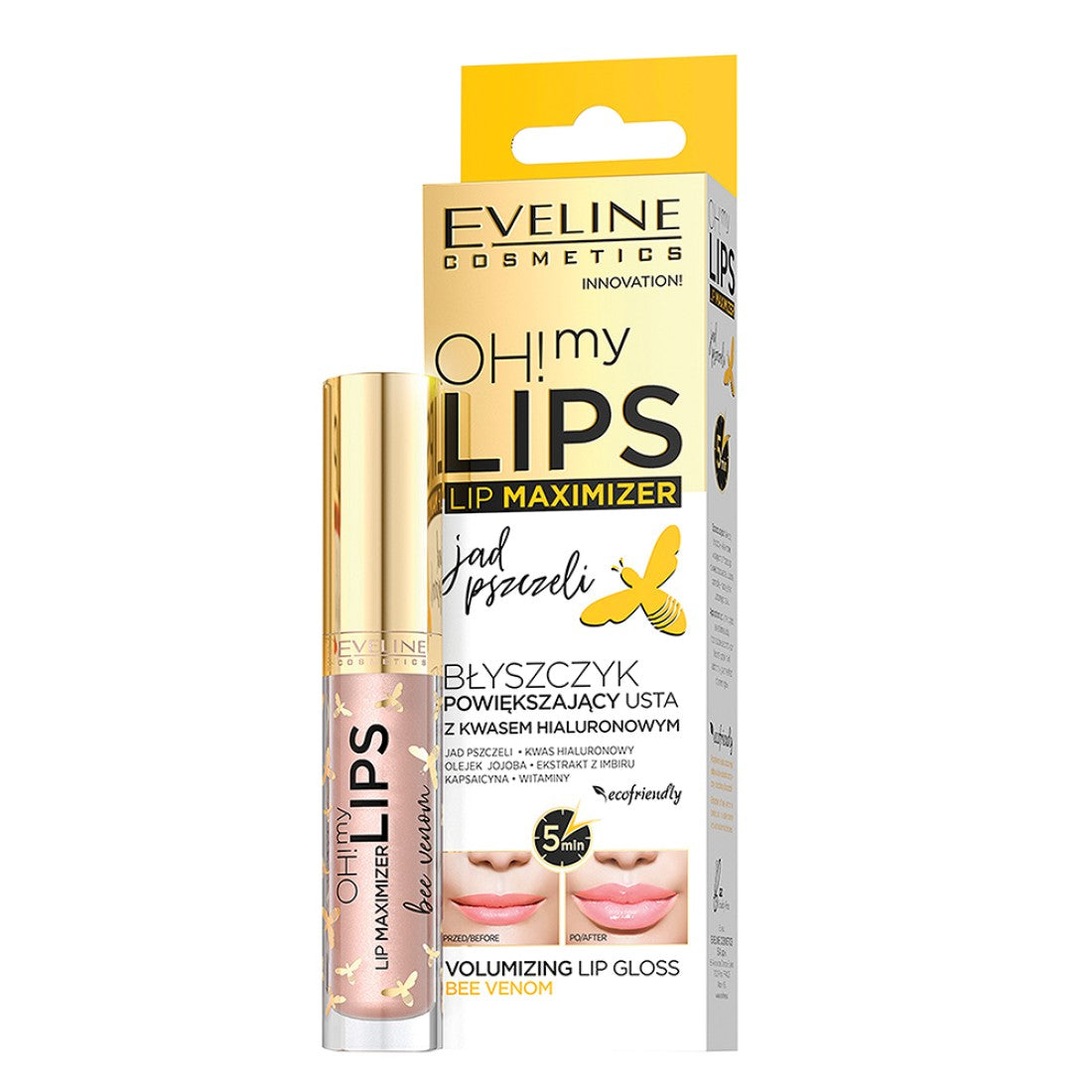 Luciul cu efect de marire pentru buze Eveline OH! My Lips Bee Venom reprezinta o alternativa excelenta la procedurile invazive de marire a buzelor cu acid hialuronic. Acest luciu de buze utilizeaza tehnologia revolutionară VOLUME MAXIMIZE, care actioneaza imediat dupa aplicare datorita continutului de venin de albine. Veninul de albine dilata vasele de sange si accelereaza microcirculatia, rezultand intr-o marire vizibil a buzelor chiar si dupa doar 5 minute.